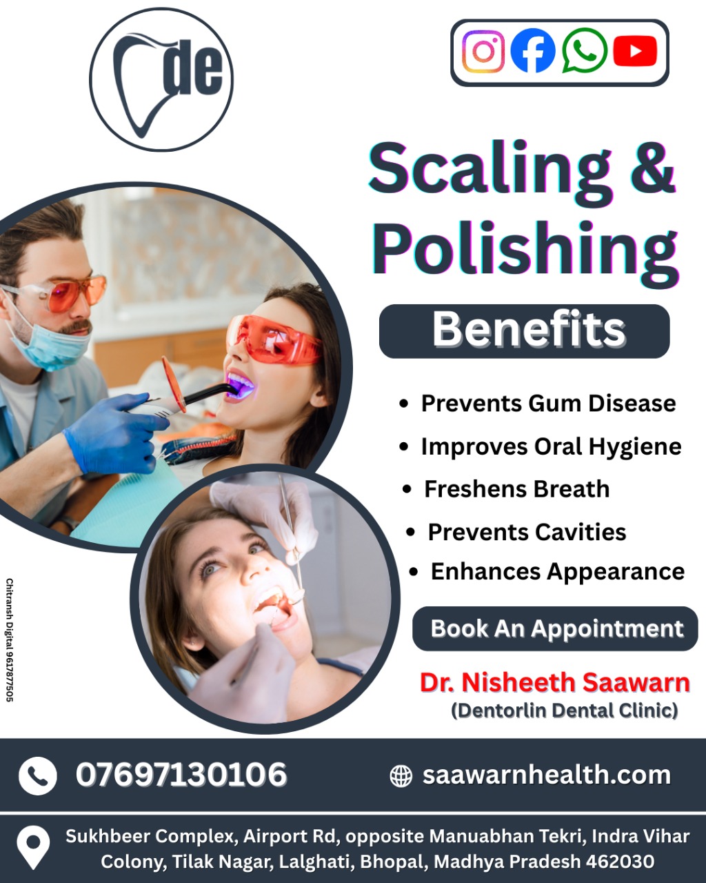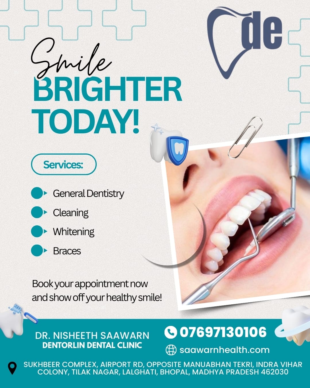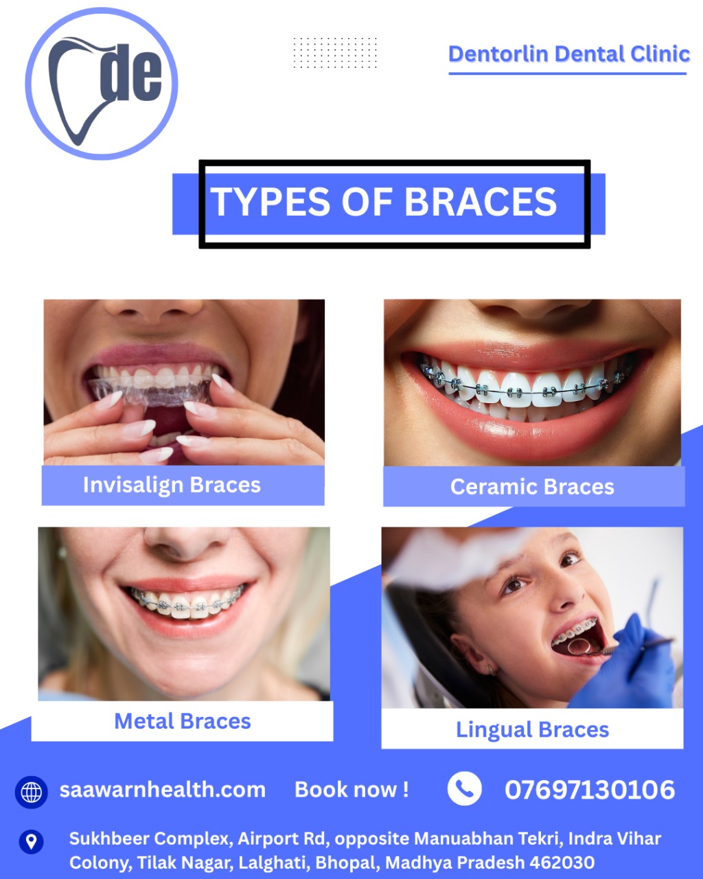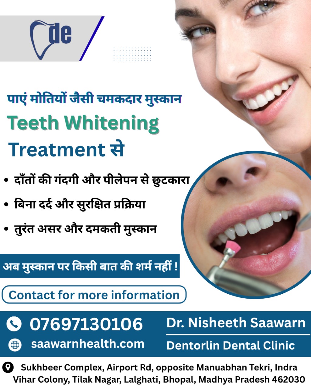 Quality, affordable, and authentic dental services at the best Dental clinic in Bhopal by an experienced team of Dental surgeons from Bhopal. At 'Dentorlin' dental clinic we (Dr. Nisheeth and Dr. Swati Saawarn) are the qualified dentists (postgraduates-MDS) and academician (at senior levels in dental educational institutes of Bhopal) with over a decade experience are committed to offer and execute high-quality dental treatment procedures for people of Bhopal city with latest and advanced techniques (like dental implants) and equipment (laser dentistry etc.) at reasonable charges. Our dental clinic locations (Sukhbeer Complex, Airport Road and S13, Gokul Dham, Karond Bypass Road) are easily accessible for anyone residing in this city.